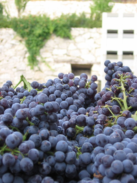 Finally, one more shot, this one in the cellar of Grenache clusters on the sorting table being fed into the destemmer machine. We destem most of our reds (with the occasional exception of an occasional Mourvedre lot a la Bandol, some Tannat which is unwilling to be destemmed, and our Vin de Paille red) to keep them from accumulating tannins from the stems. You can see the clusters falling into the destemmer, and the violence of the destemming process.
