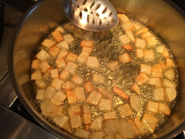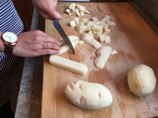 Phase 1: Chopping potatoes and garlic, getting them ready for their deep fry!