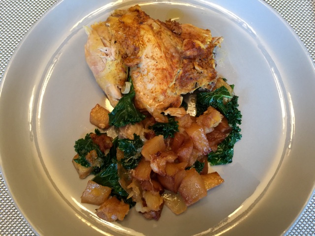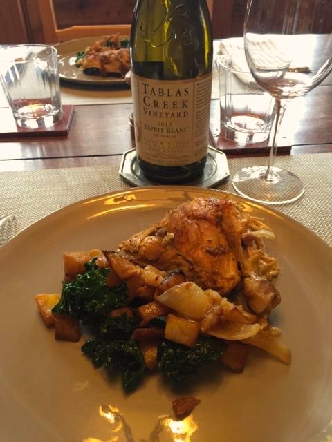 Like I mentioned before, this dish is so wonderfully simple and completely satisfying. After having made this dish several times in the past, I decide to pair it with our 2013 Esprit de Tablas Blanc (71% Roussanne, 21% Grenache Blanc, 8% Picpoul Blanc). Roussanne, the leading grape in this blend, is our primary and most important white grape on both the property here and at our sister winery, Chateau de Beaucastel. A truly beautiful blend that confounds even the primarily red wine drinkers- it's rich and viscous in the mouth with a perk of fresh acidity on the finish. We were all in agreement that the pairing was wonderfully balanced in terms of both structure and acidity, and that the warm spices of turmeric and paprika was accented by the warm notes of the wine. On the nose, there are rich notes of peach pit and highly fragrant honeysuckle, and my favorite, nutmeg. This wine tastes of grilled peaches with those subtle warm spices becoming more evident, along with some perfectly ripe nectarine. I absolutely love this wine with this dish- this will be the third time I've enjoyed it with a Tablas Creek white. The last time I made it, I tried it with a 2008 Roussanne and it was honestly one of the best food and wine pairings I've produced. The acidity was present, but toned, and the years in the bottle had concentrated the flavors of honey and nuts. If you have the patience, try this dish with an older vintage Esprit de Tablas/Beaucastel or Roussanne, but if not, do not fret- it is wonderful with young Roussanne, too, and proof that a single dish can satisfy both picky eaters and sophisticated foodies.