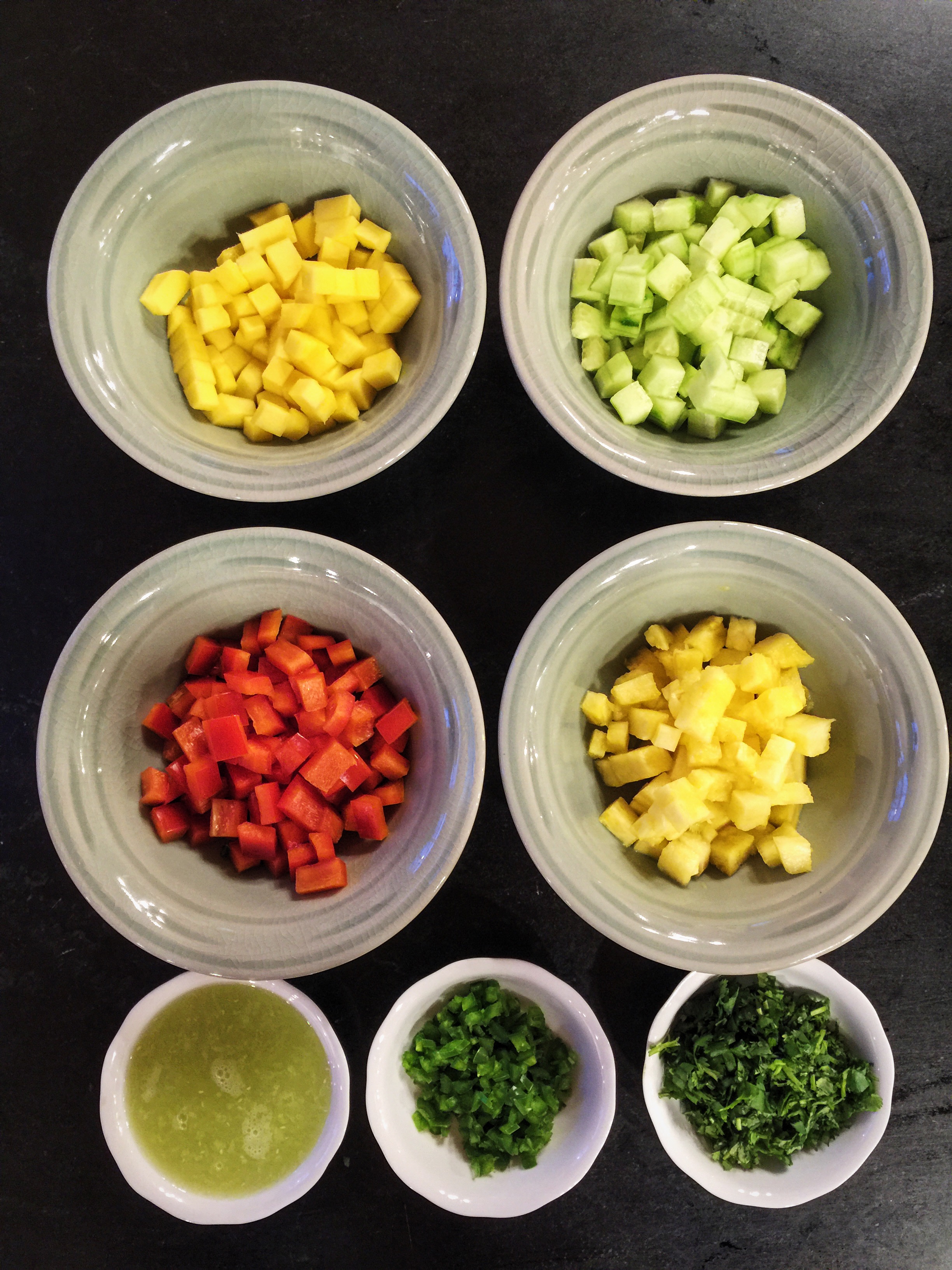 The fruit and vegetable prep for the tropical salsa- there may have been a tropical drink consumed in the making of dish.. hey, I didn't want to waste any of that delicious fruit!