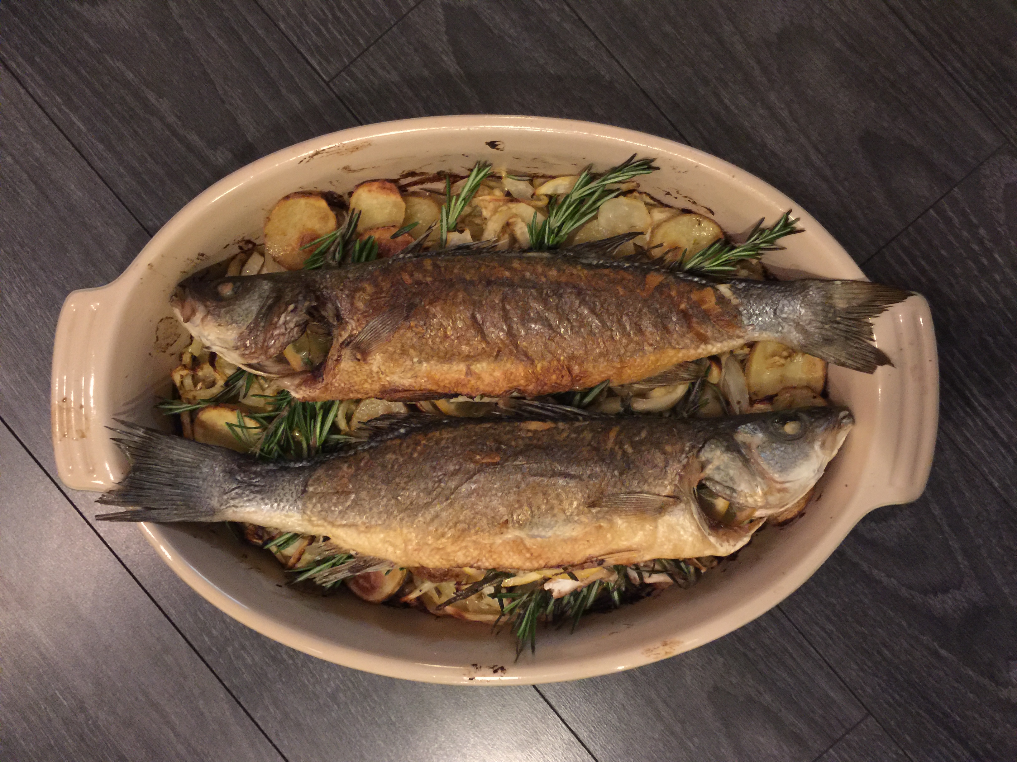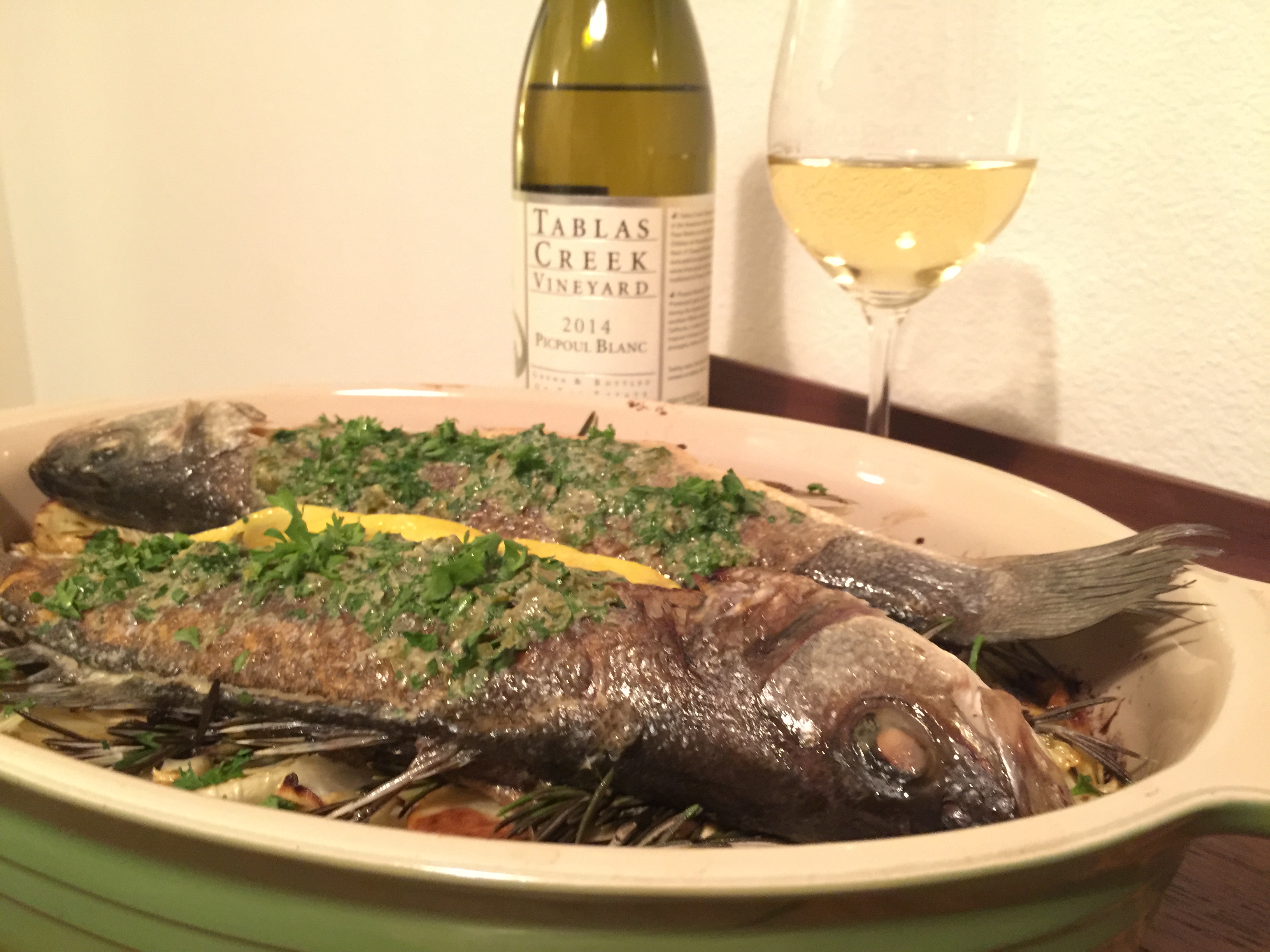 If you've never had Picpoul Blanc before, you're definitely in for a treat. To me, it has acidity and citrus notes like a well balanced Sancerre, with structure similar to that of Muscadet. I am a huge fan of this grape variety, whether it's blended in small portions into our Esprit de Tablas Blanc or on it's own. By itself, it has this beautiful savory quality, and because of its structure and a minerality that is almost briny in character, I chose to pair this with roasted Branzino. Branzino is a Mediterranean white fish that is known under a few different monikers, including the French loup de mer. Known for its firm texture and light/delicate flavor, it's versatile in the kitchen. Roasting whole fish is one of my go-to's in the summer time, and although it's not technically summer yet, the longer days with the stretches of mid-eighty degree weather have got me feeling like it's time to break out some of my favorite summer recipes. Also, I often forget I live in beautiful Paso Robles, California, where there are certainly more days of warm weather and sun than I used to see in Vermont! A favorite recipe of mine is Roasted Branzino with Caper Butter (contributed by Steve Corry to Food & Wine Magazine). I couldn't resist roasting some fennel, onion, and potato additionally to this dish (so that's what I did!) Here are the results from what I consider to be a very successful pairing:
