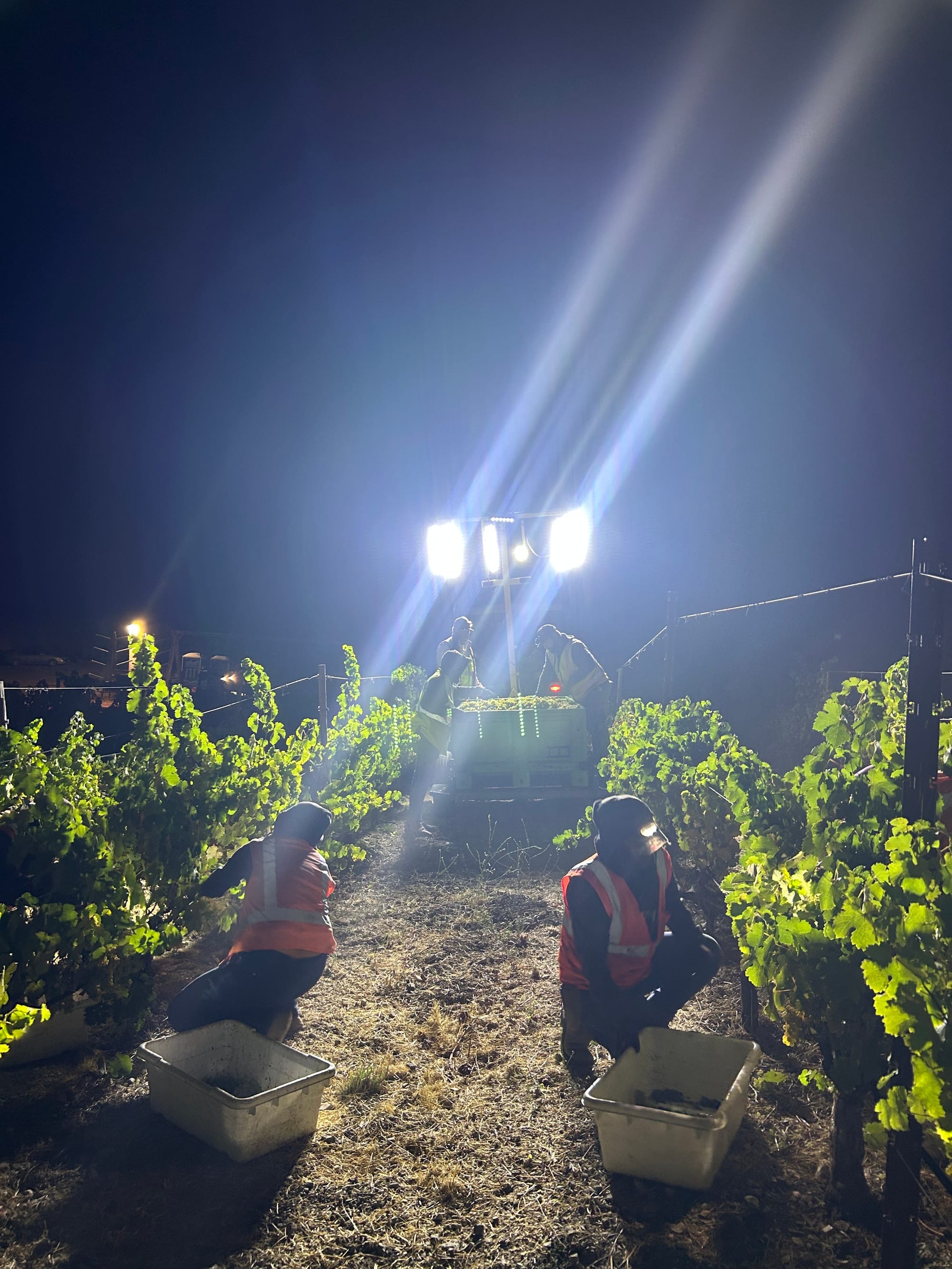 Next (below) a photo of the first pick of Viognier, at night under the lights. We try to pick most of our whites at night because the cooler temperatures are better for the grapes and for our team. Reds, which are sturdier, tend to get picked in the morning. Either way, we're usually done in the vineyard by noon, although the work in the cellar will continue into the evening.