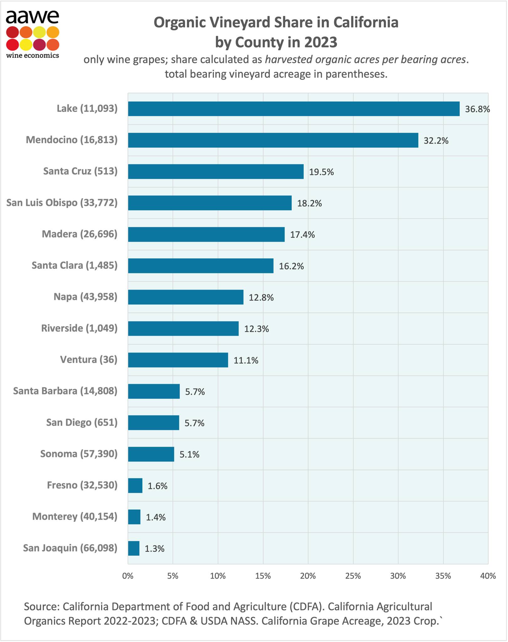 But while we have felt that the tradeoffs in wine quality, vineyard health, and our team's working environment are worth the extra labor costs, we're still in the definite minority. A chart shared by the American Association of Wine Economists shows that only 9.3% of California vineyard acres were certified organic in 2023: