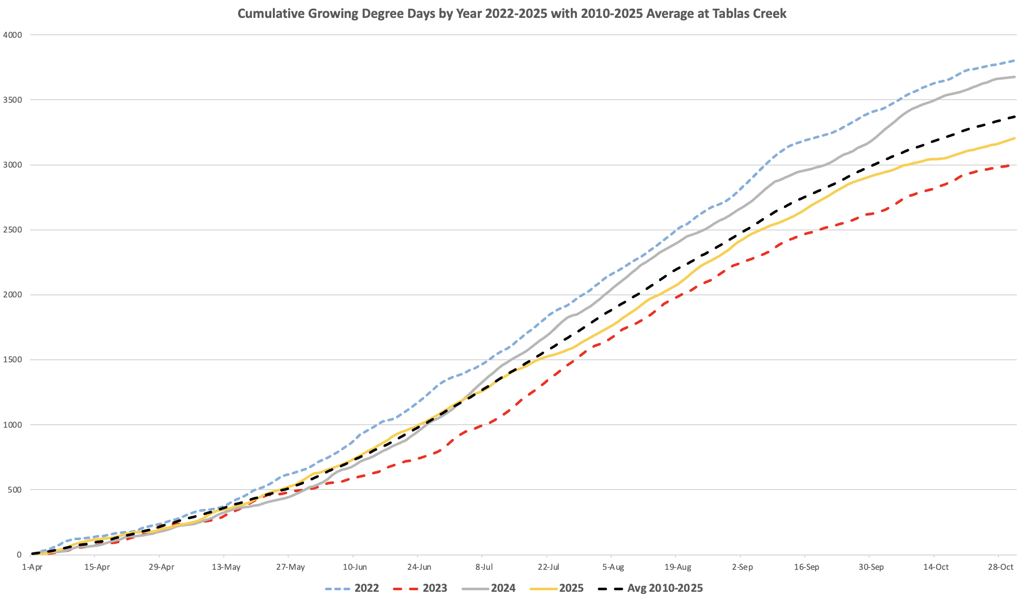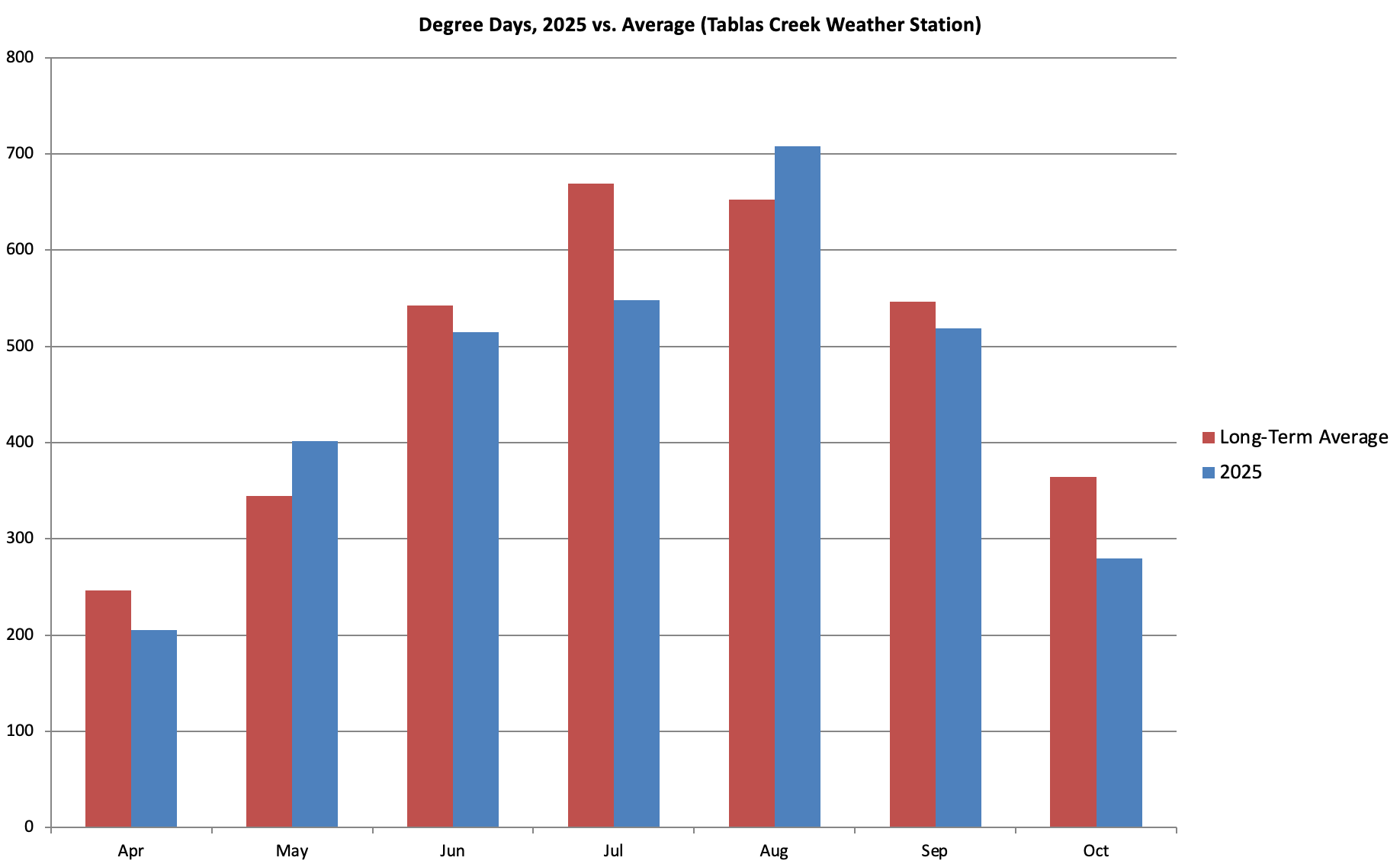 I've shared a version of this heat accumulation graph in a few blogs this year. But I will share it again to bring you up to date. 2025 is the solid orange line. You can see that we were hovering around average – and actually warmer than 2024 – until late June. Our unusually cool mid-July brought us below the long-term average, though never as far below as we were in 2023. A relatively warm August caught us up a bit toward the norm, but cool weather in early September and again around our rain event in mid-October brought us to where we finished, having accumulated about 5% fewer degree days than average: