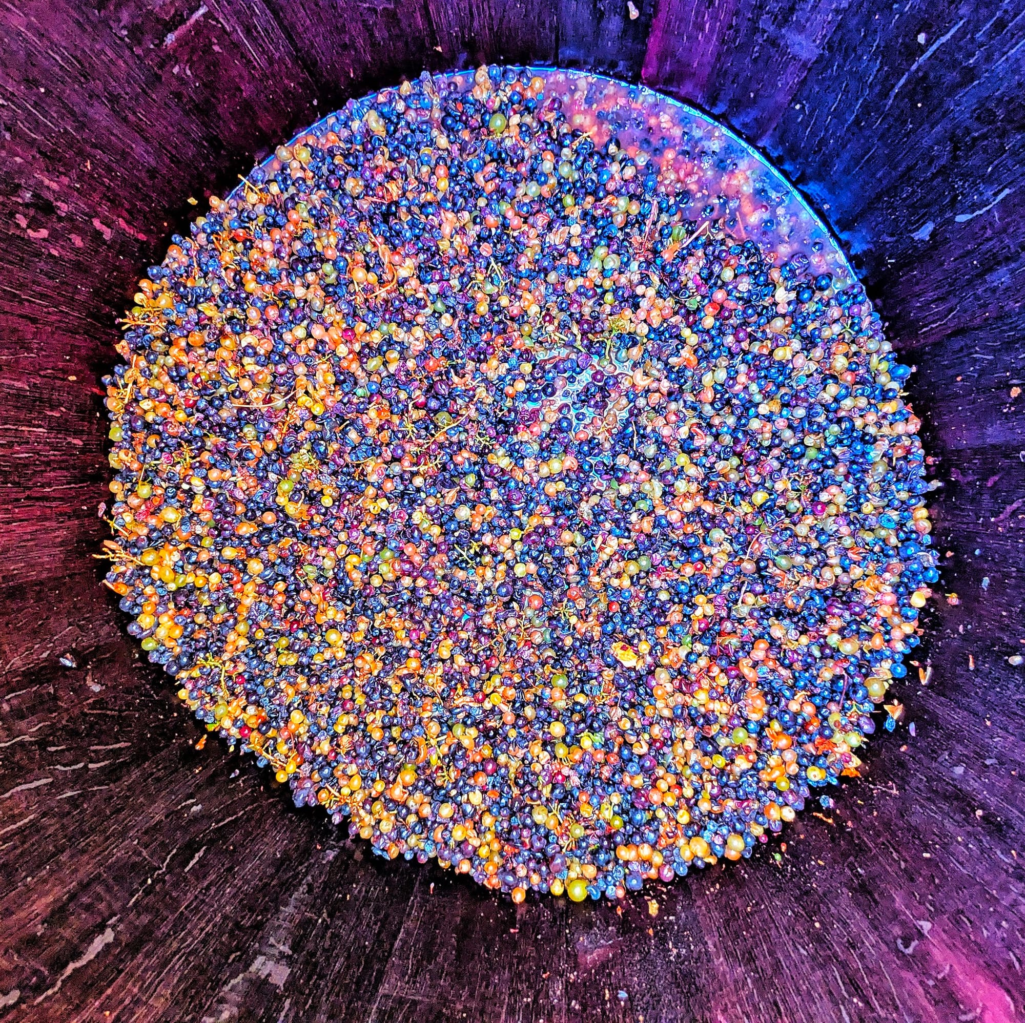 The primary things we'll remember about 2025 will be the exceptionally moderate summer (with the fewest 100°F days in our history here) and the two unusually early rain events, one on September 24th and one on October 14th, that forced a scramble before to pick what was ready and a temporary pause after. In the end, both were followed by sun and dry weather that allowed the fruit to reconcentrate, and we were able to bring in nearly everything. That included an experimental lot, harvested from all the mother vines around our tasting patio and our new demonstration block, that provided a striking image the last day in the cellar: