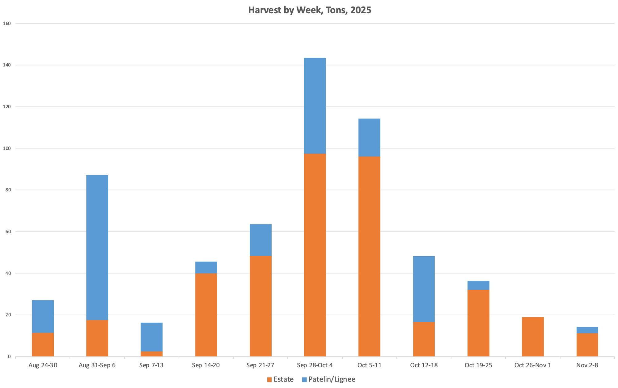 Last Tuesday, with small clean-up picks of Grenache, Cinsaut, and Counoise and one recalcitrant lot of Bourboulenc (more on that later) we completed the 2025 harvest. This was the 11th week of harvest, which was our longest in more than two decades and our second-longest ever. In the chart below, orange bars are our estate lots, while blue represents purchases for the Patelin or Lignée programs: