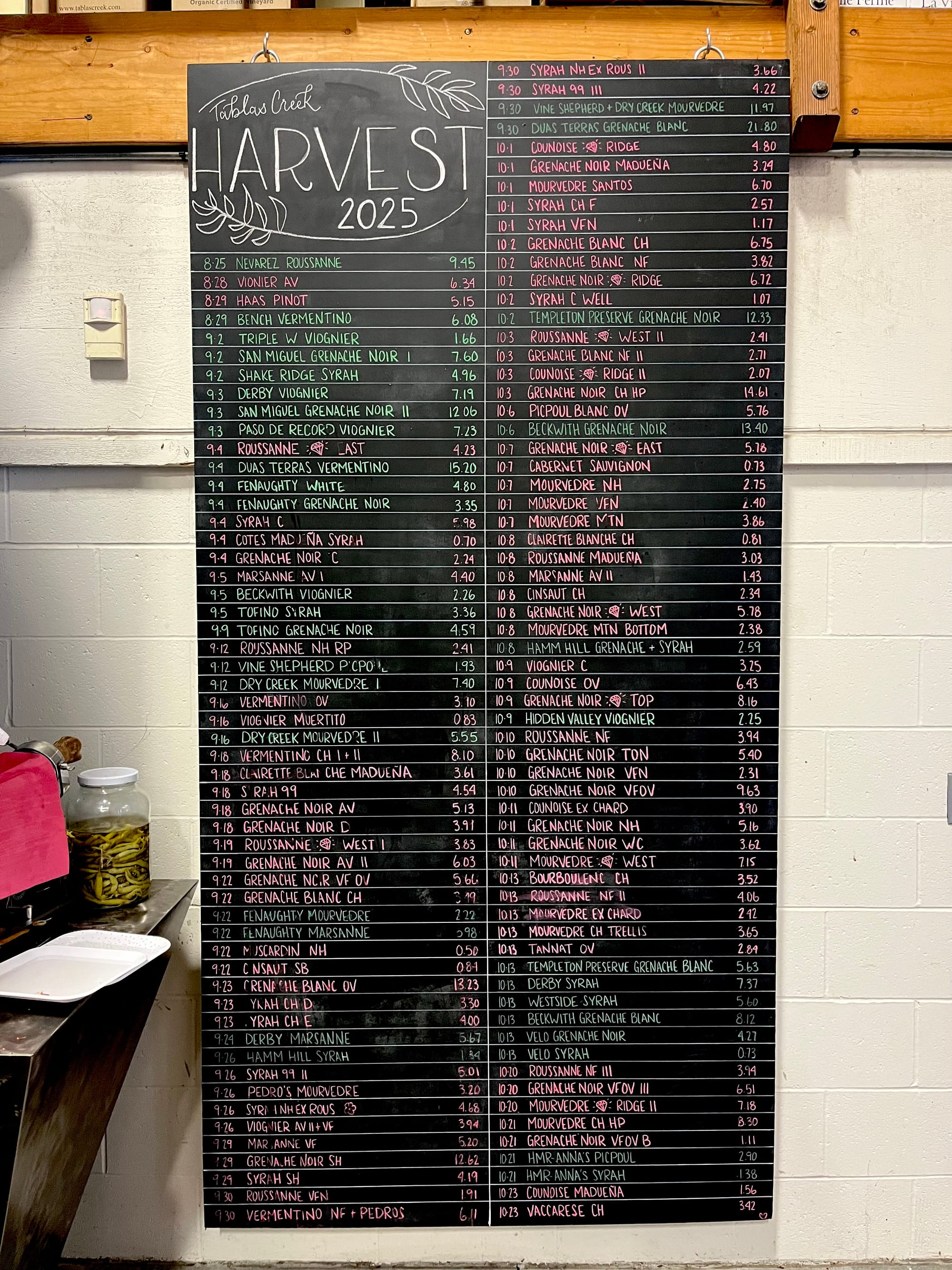 We had 134 harvest lots, an increase of three vs. 2024. These included eight more estate lots (96 instead of 88), one fewer Lignée lot (6 instead of 7, thanks to us being able to co-harvest and co-ferment some of the grapes we got from the Fenaughty Vineyard) and four fewer Patelin lots (32 vs. 36). Despite the relatively similar number of lots, the total quantity of fruit (615 tons) was about 15% more than last year, a reflection of our ability to find some larger lots and our decision to use more estate fruit for our Patelin wines than we have since 2020. Our full harvest chalkboard (below) is actually incomplete, as we're still looking for the best way to display the 14 lots that came in after we ran out of space on October 23rd:
