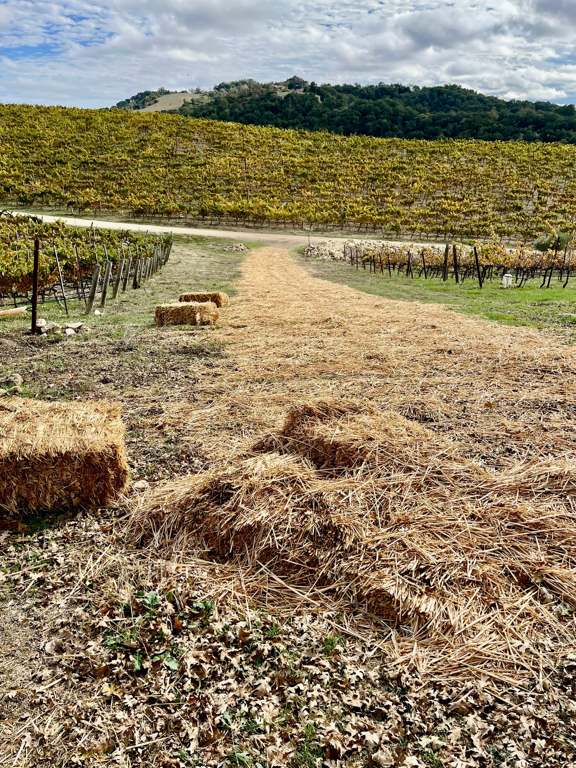 In preparation, we've been getting the vineyard ready for winter. We've tilled and seeded a few areas where we wanted to break up the soil, and seeded through last year's mat of grasses in other blocks. We're also laying out straw on our roads to minimize the risk of erosion (though that's less of a risk than many years because our early rain has already sprouted a carpet of green):