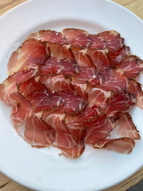This iconic spot in Austin, Texas supports regenerative agriculture in the kitchen and in the cellar. In early spring on a rare frigid night, we got together to do a central coast themed barbecue event with our wines, and as they do in Texas, they take the barbecue awfully seriously. I got there a bit early to snag a couple bar snacks as the tri-tip was finishing up.