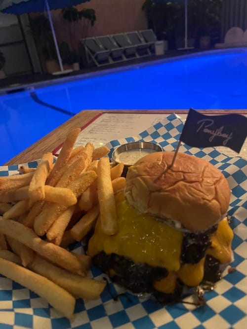 The Pearl Hotel in San Diego has a great poolside retro restaurant called Pony Boy, where they advertise "Michelin meets mid-century". Wash this Wisco' Buttaburger through the veins with the Patelin de Tablas Rosé on tap.