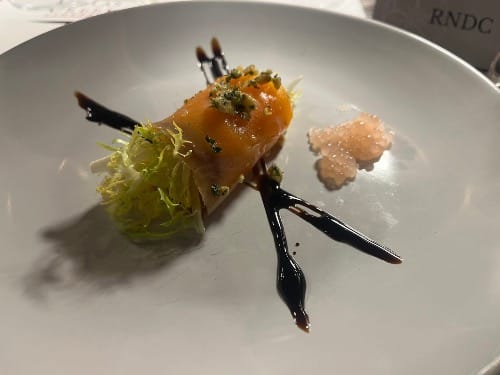 This was a fun one. DeLille grows our clones in Washington, and also has a serious restaurant just east of Seattle. I hosted a Tablas Creek wine dinner there in June, and one of the most subtle courses and pairings stood out to me the most: Ora King Salmon gravlax on frisée with caviar, marcona almonds, and a balsamic reduction, served with Dianthus Rosé 2024. An example of a wine dinner where the chef is fully committed, tasting the wines first, then composing the menu afterward.