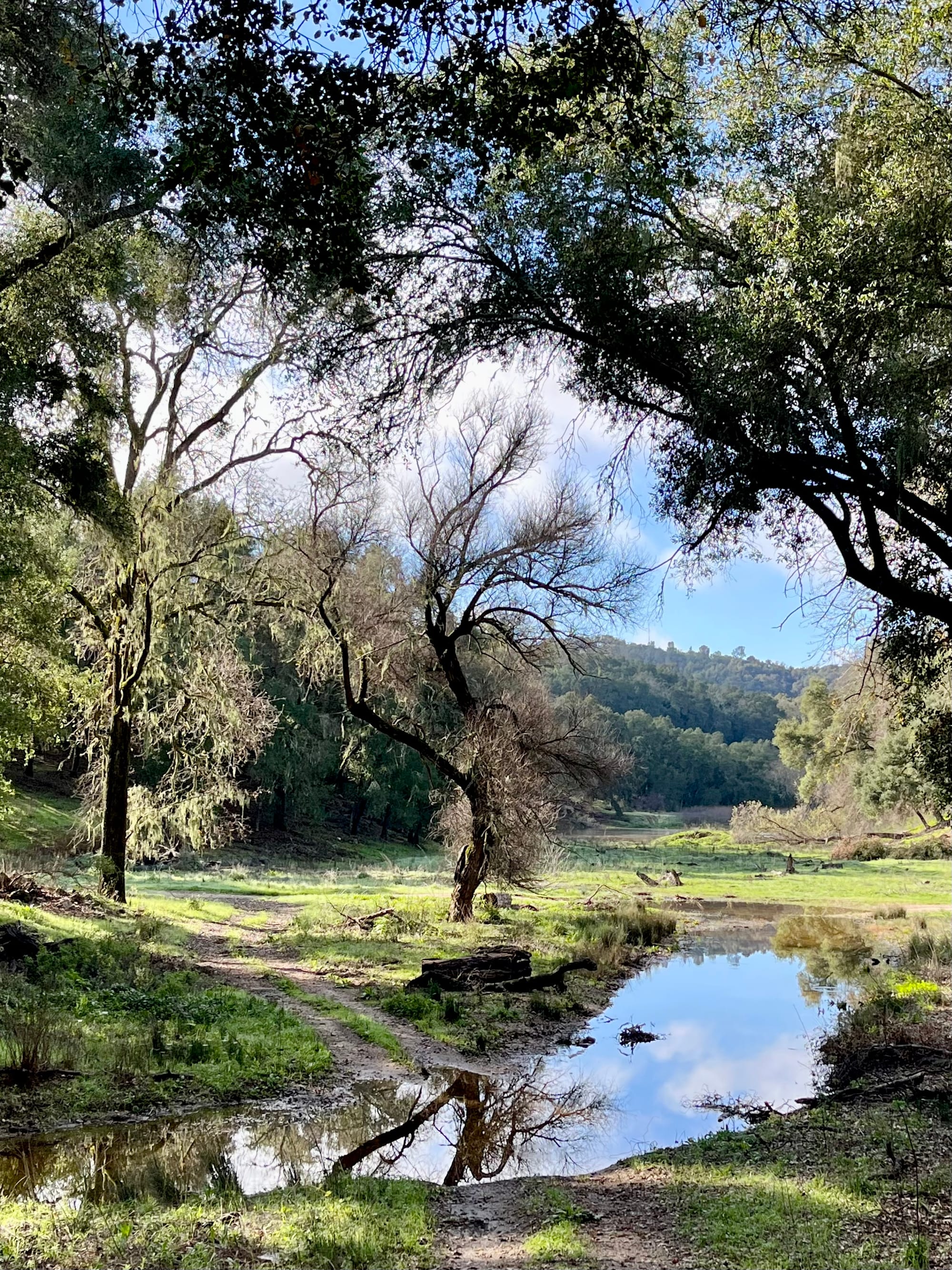 For the winter, we're at nearly 16 inches, which is 176% of what we'd expect as of January 6th. But just as important as how much rain we've received is how it has fallen. In a climate where rain often comes in massive doses, sometimes overwhelming the soil's capacity to absorb it, this year's precipitation has come gradually. We've tallied 18 days with at least a tenth of an inch of rain, and just five of those days have exceeded an inch. Just two have exceeded an inch and a quarter, and just one (Christmas Eve) exceeded two inches. That has meant that it has all soaked in. Las Tablas Creek is barely flowing: