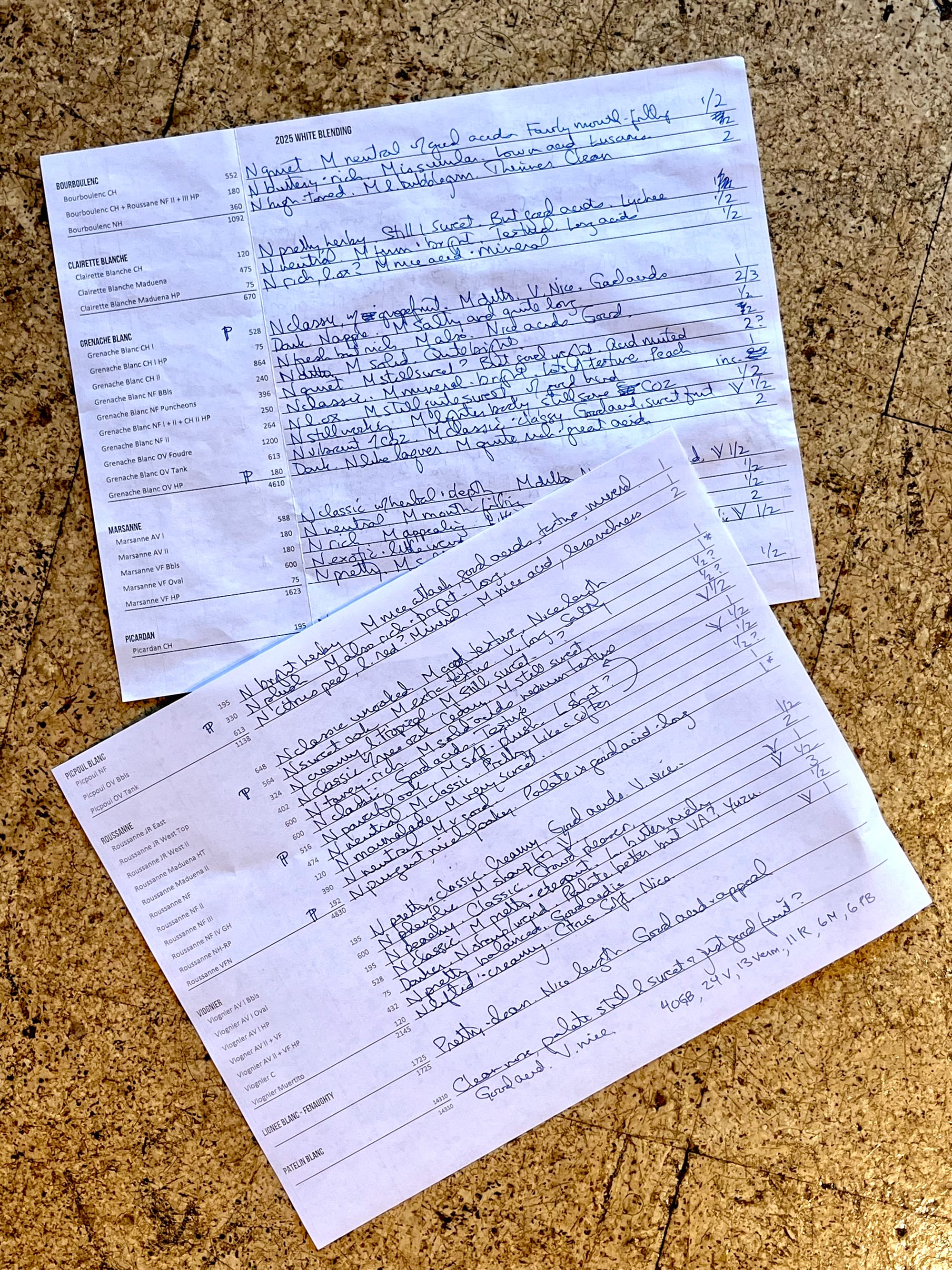 We welcomed Francois and Matthieu Perrin last week for three days spent around our blending table, working to turn the 43 different estate lots we made from our white grapes in 2025 into the blends and varietal bottlings we'll be releasing to you in coming months. I think it's fair to say that we left the blending table thoroughly excited about the vintage. We saw outstanding quality across the board, with both power and freshness. We also saw the impact of the improved yields in 2025, which allowed us to make all the blends we count on (including our second-ever Panoplie Blanc) as well as a complete lineup of varietal bottlings for the first time since the 2021 vintage. What did we make? And how did we decide what to put into the blends we'll be bottling over the coming year? Read on.